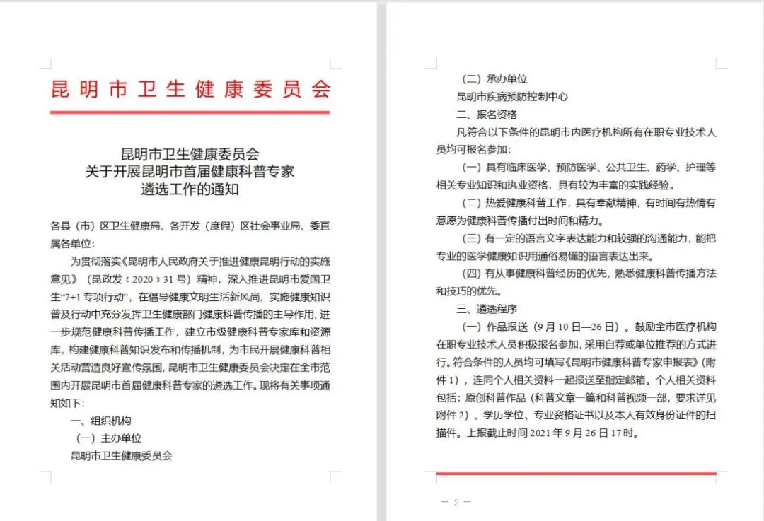 为贯彻落实《昆明市人民政府关于推进健康昆明的实施意见》精神,深入推进昆明市爱国卫生“7+1专项行动”,在倡导健康文明生活新风尚,实施健康知识普及行动中充分发挥卫生健康部门健康科普传播的主导作用,进一步规范健康科普传播工作,建立市级健康科普专家库和资源库,构建健康科普知识发布和传播机制,为市民开展健康科普相关活动营造良好宣传氛围,昆明市卫生健康委员会于2021年9月10日启动了昆明市首届健康科普专家的遴选工作。