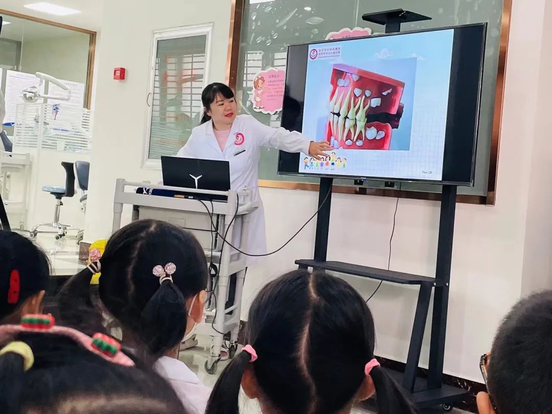 医生首先让小朋友们了解牙齿的结构与功能,并播放了爱牙动画片引导小朋友思考,为什么会得龋齿?龋齿的危害都有哪些?怎样预防龋齿的发生?如何正确地刷牙?在讲座中,孩子们认真聆听,积极踊跃地举手参与互动回答问题。