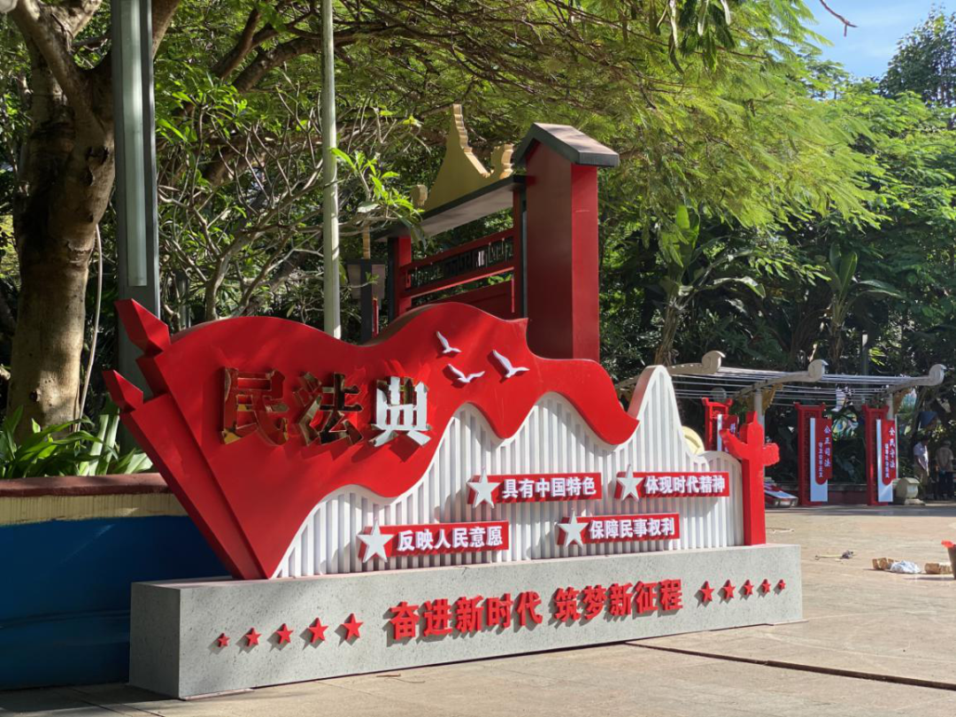 文治光昌法治文化广场的建设,在不改变原有景观功能的基础上,将法治广场标识牌、依法治国16字方针宣传标识、卷轴式普法宣传景观、有声法典墙和雕刻有法治宣传标语的石凳等法治元素与广场有机融合,并着重围绕宪法、习近平法治思想、法治中国建设规划和民法典等内容进行了宣传。