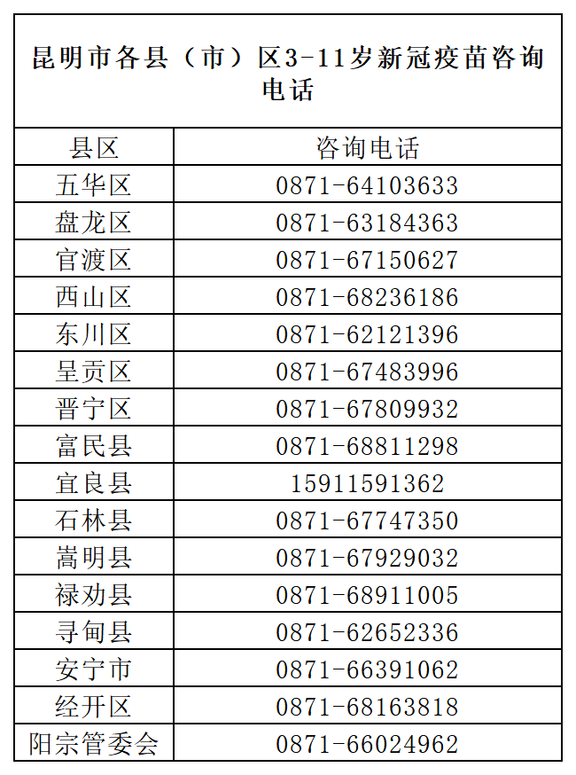 8、昆明市各县(市)区3-11岁新冠疫苗咨询电话