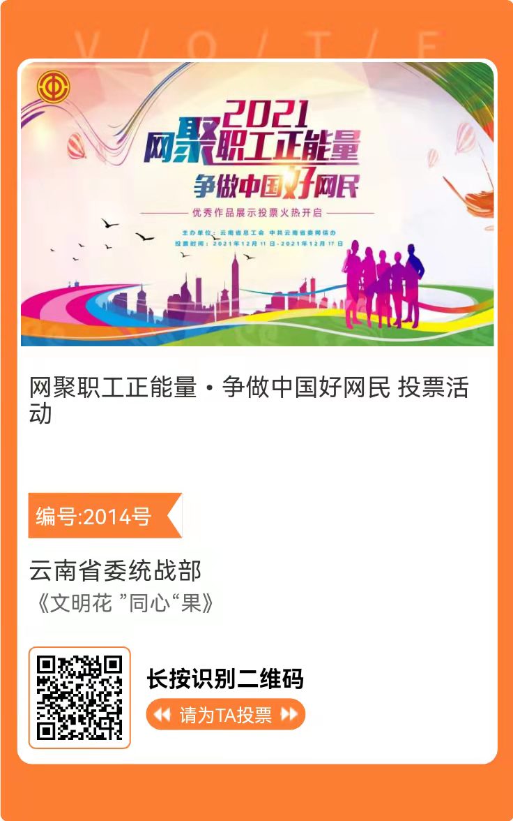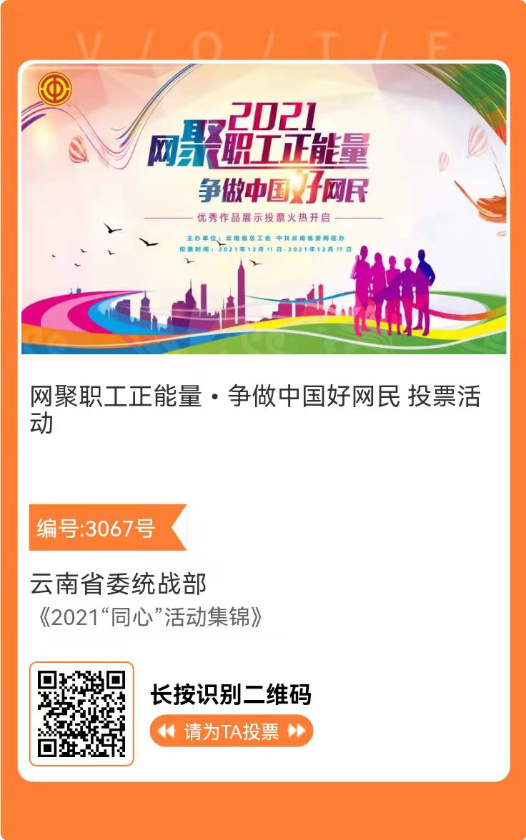 云南省2021年“网聚职工正能量 争做中国好网民”主题活动由云南省总工会和中共云南省委网信办联合开展,旨在引导全省广大职工网民积极参与清朗网络空间建设,12月11日至17日,活动正式进入优秀作品投票环节,评选后,每类项目将各评选出一等奖3名、二等奖6名、三等奖9名。