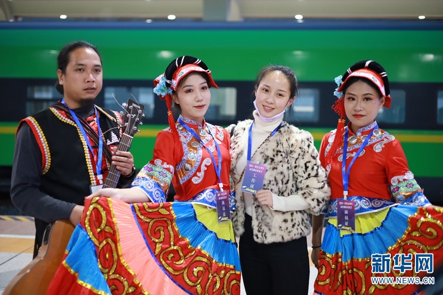 工作人员为旅客表演民族舞蹈。新华网发(中国铁路昆明局集团有限公司 供图)