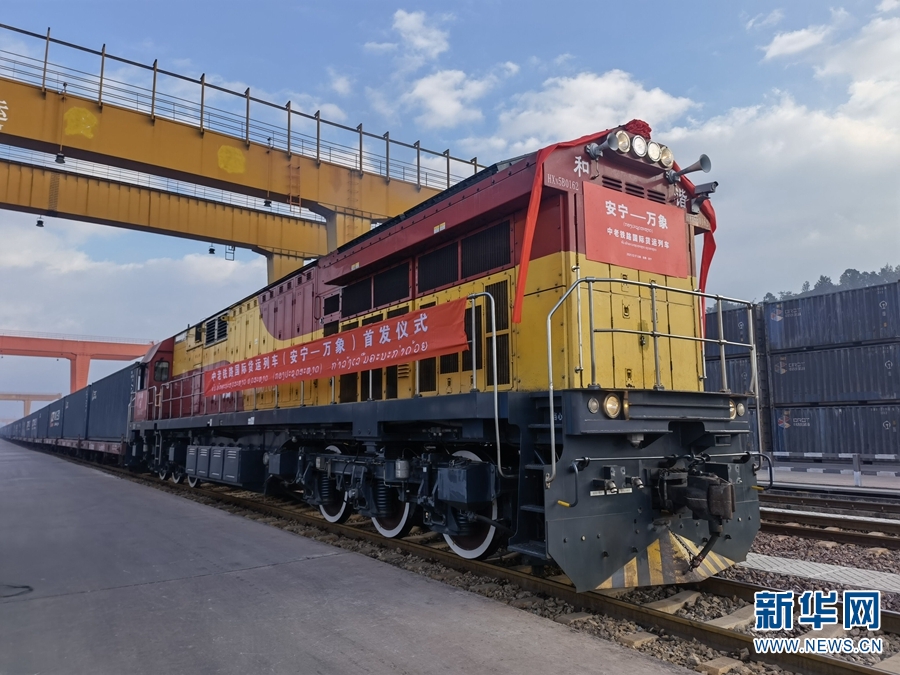 2021年12月17日,安宁至万象中老铁路国际货运列车首发。新华网发(中国铁路昆明局集团有限公司 供图)
