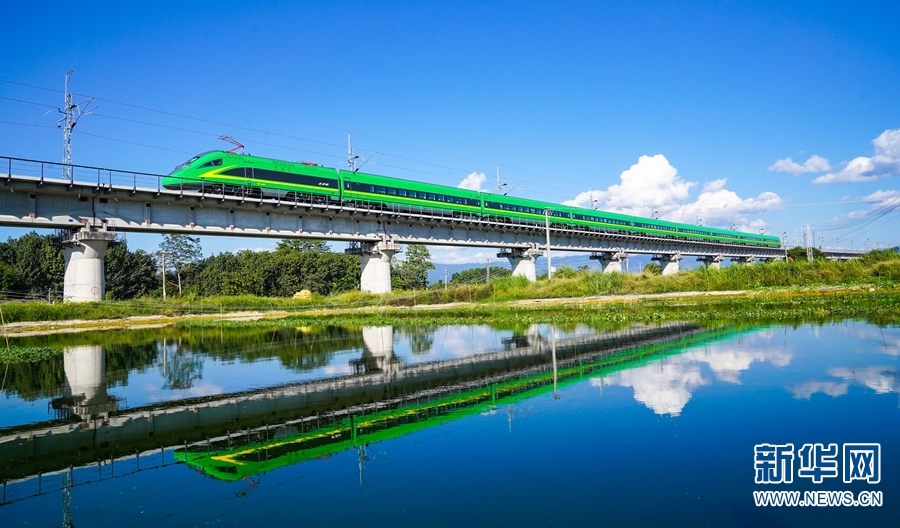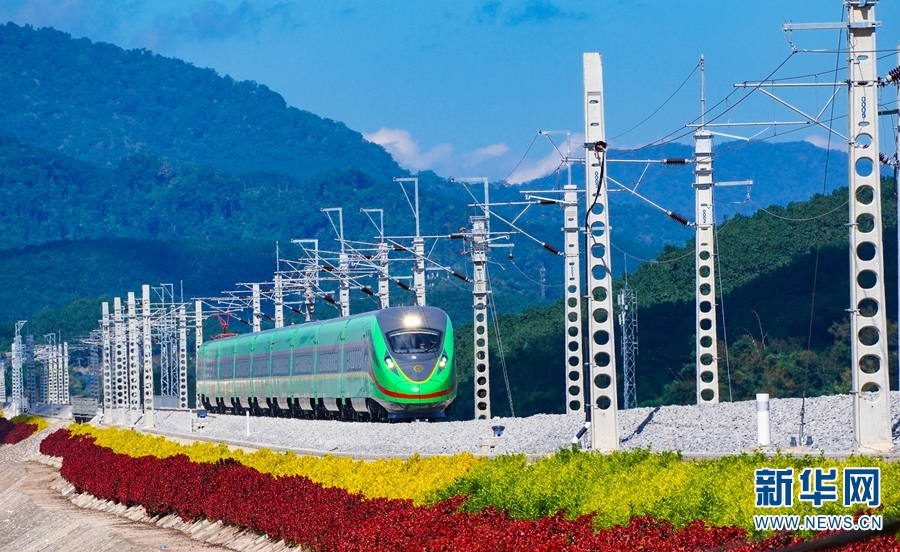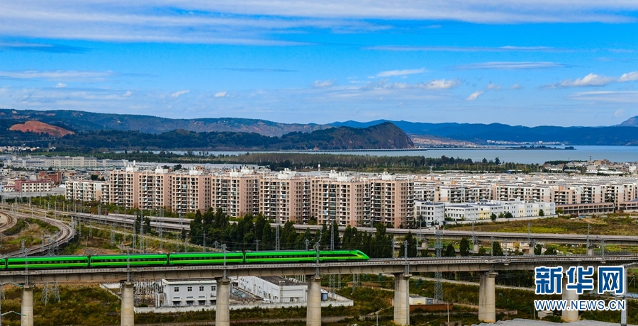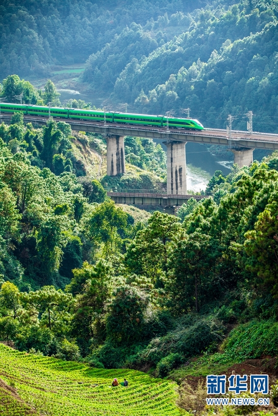 “绿巨人”奔驰在中老铁路玉溪段。新华网发(何俊云/摄)