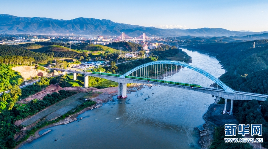 航拍视角下,“绿巨人”奔驰在元江双线特大桥上。新华网发(付世凯/摄)