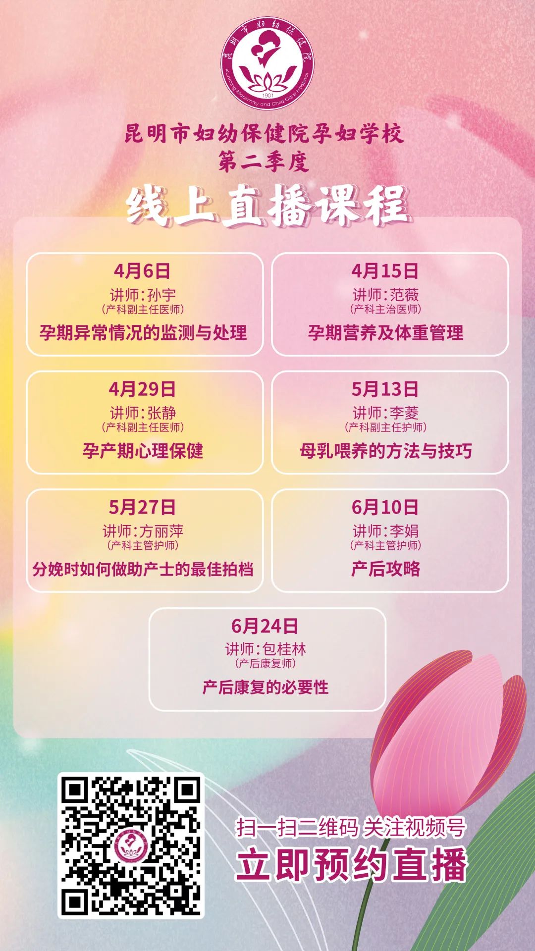 温馨提示:昆明市妇幼保健院孕妇学校直播课时间为:4月6日、4月15日、4月29日、5月13日、5月27日、6月10日、6月24日的下午15:00--16:00。