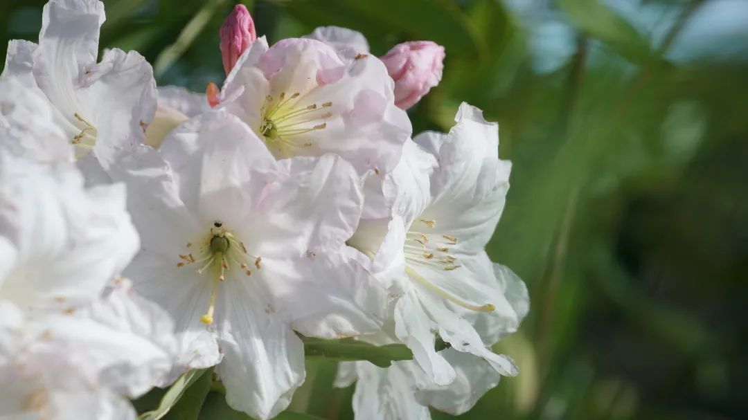 饭毕,我继续前行,走过寺庙,去看后山的大白花杜鹃。微风拂过,空气中都是青草和鲜花的味道,一抬头刚好看到满山的白色杜鹃花。走近看时,她白得很特别,花瓣像玉一样光洁,如雪一般绽放。她的花朵上竟一丝杂色都没有,身姿绰约,如同落入凡间的仙子。她的叶子绿得莹亮,如同翡翠,圆润可爱。她的花朵三三两两地抱成一团,虽花开似锦,却并不喧闹。