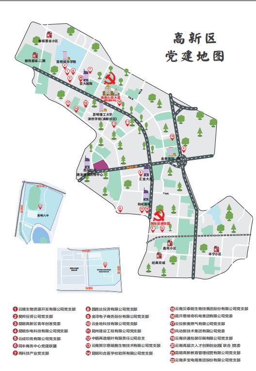 昆明高新区是1992年经国务院批准成立的云南省首个国家级高新技术产业开发区,建区以来秉承“发展高科技、实现产业化”的宗旨,不断壮大园区规模和实力,形成了“两主(生物医药、金属新材料)+两辅”(数字经济、现代服务业)的产业布局。为抓好园区党建工作,高新区坚持“围绕发展抓党建,抓好党建促发展”,在机关、两新、国企、街道形成领域特色党建模式。其中,两新组织党建作为重中之重,不但在基层党组织数和党员数上占据“半壁江山”,也是与园区产业关联最紧密的党建领域,为此高新区通过以点带面、发挥龙头效应,积极打造以园区主干道为聚集的“海源路党建示范圈”,建强“红色矩阵”。