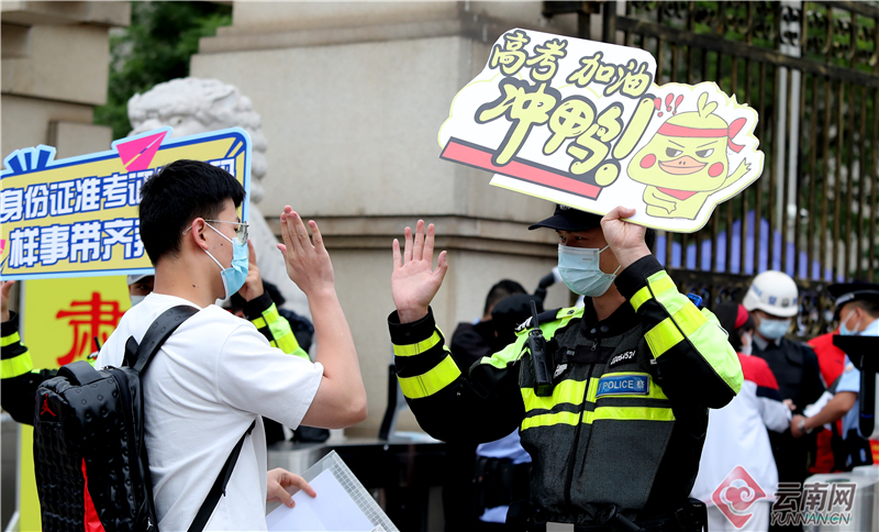 在五华考区昆一中考点,龙翔派出所执勤干警手持网络热词"高考加油"手牌和入场考生击掌,加油鼓劲。