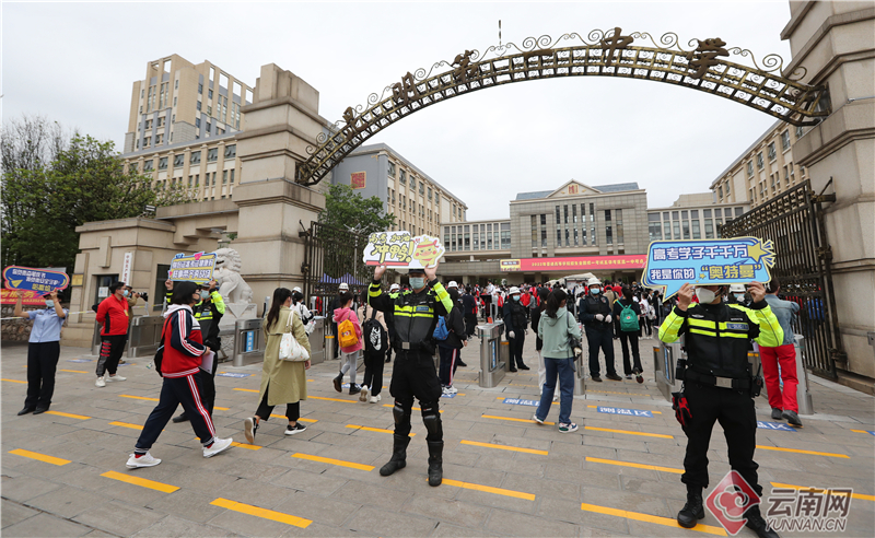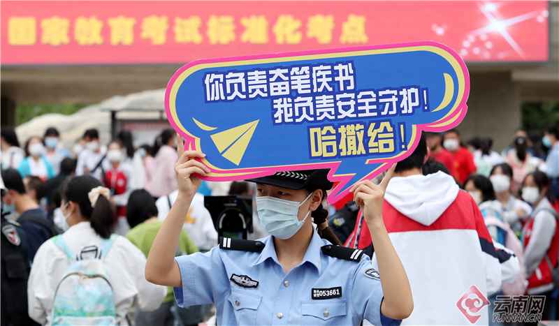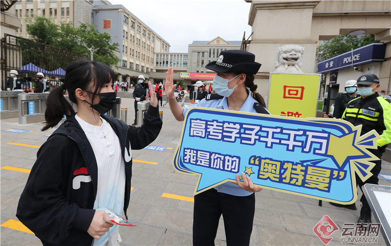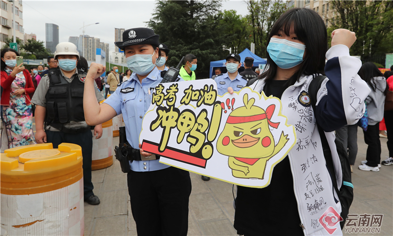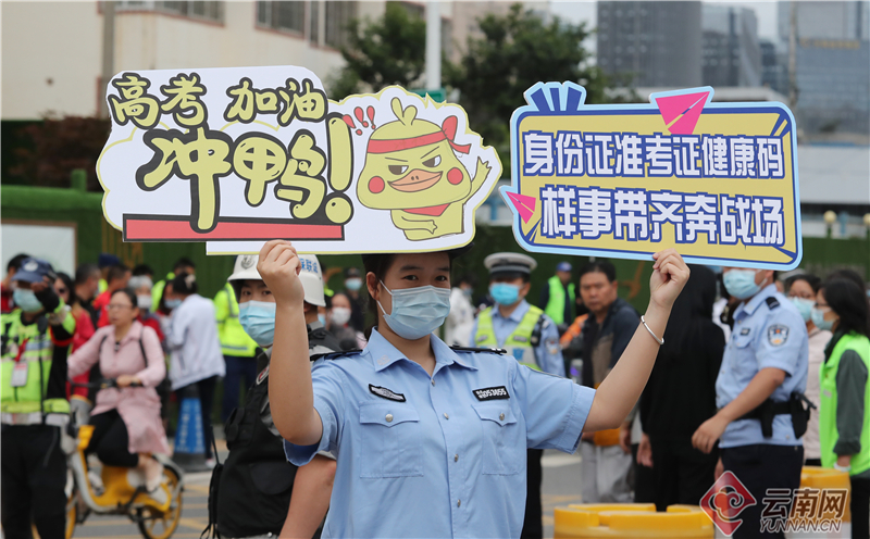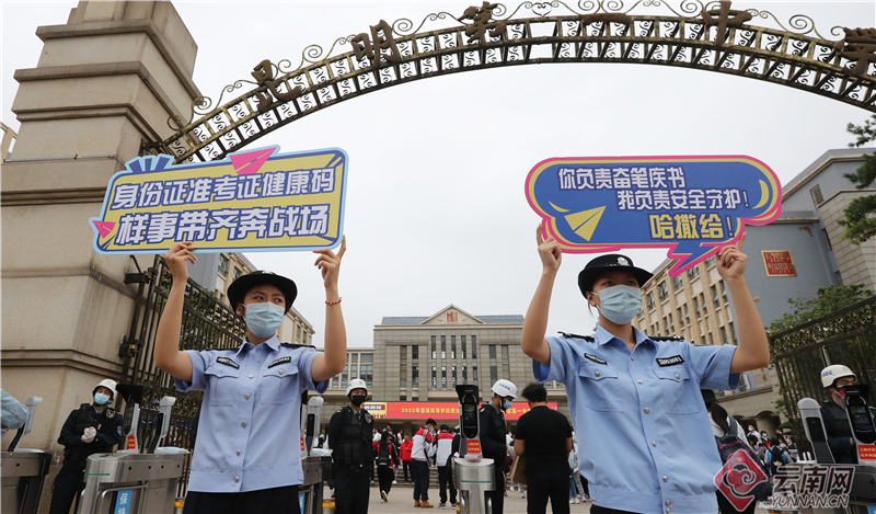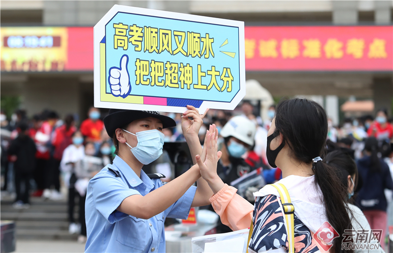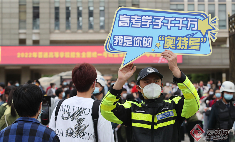 6月7日,2022年全国高考拉开序幕。在昆明市五华考区昆一中考点,龙翔派出所执勤干警手持网络热词"高考加油"手牌在现场为入场考生助威,“高考加油,冲鸭!”“高考顺风又顺水,把把超神上大分”“高考学子千千万,你是我的‘奥特曼’”……喜闻乐见的网络热词,让考生应考信心倍增,纷纷和执勤干警相互击掌,也营造了轻松愉悦的入场氛围,也让公安服务工作更具温度。