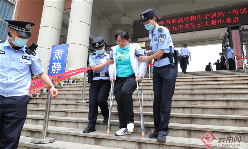 在五华考区云大附中考点,文林派出所执勤女干警在考试结束时帮助一名脚部受伤,行动不便的考生走出考点学校下台阶。