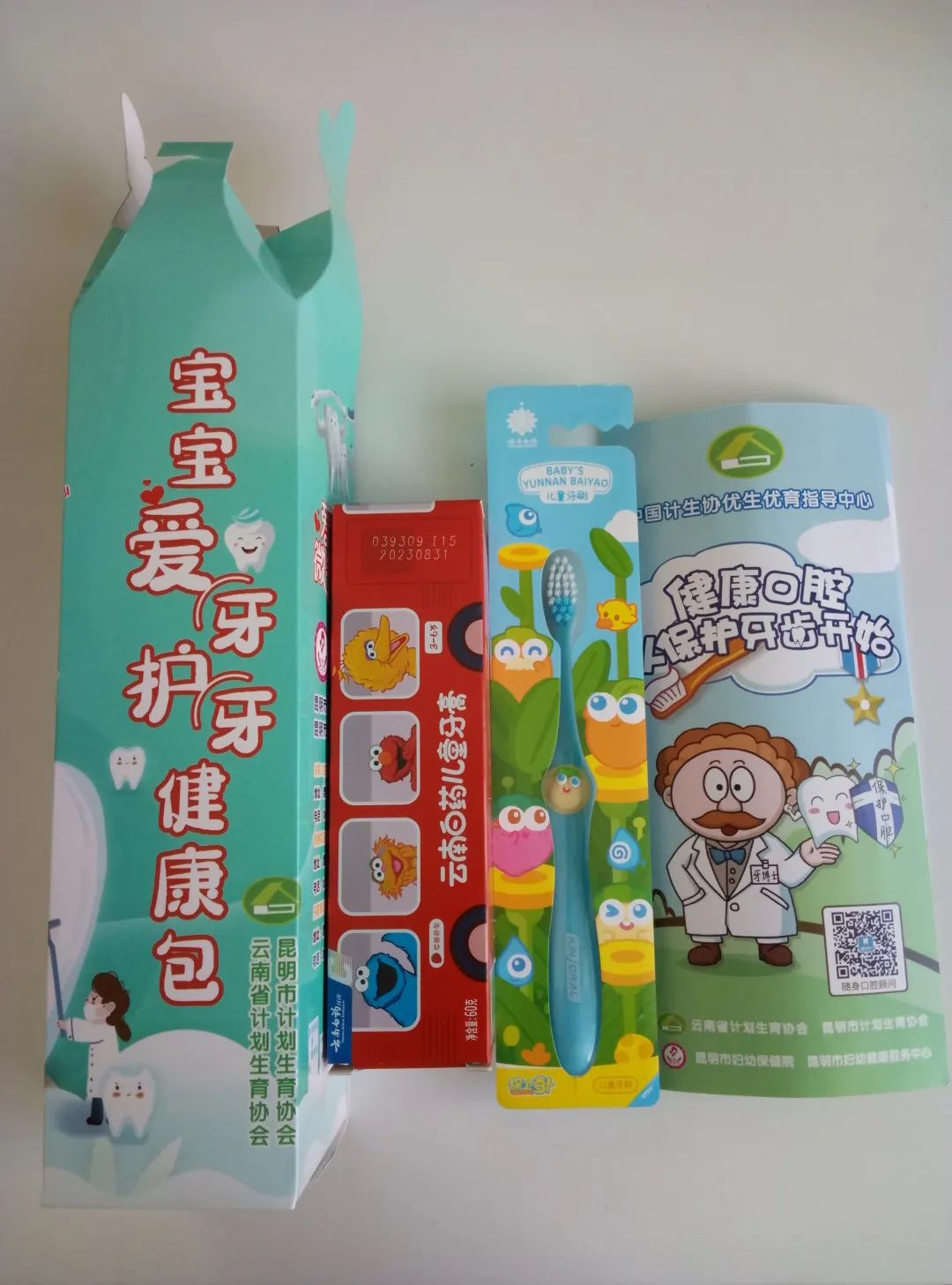 为了普及爱牙护牙知识,帮助、促进参加活动的2-3岁幼儿养成良好的刷牙、清洁口腔的习惯,活动现场还向小朋友赠送了48套优生优育指导中心精心制作的爱牙护牙套装。每个套装包含健康口腔从保护牙齿开始的折页1张,云南白药儿童牙膏1只、牙刷1支。