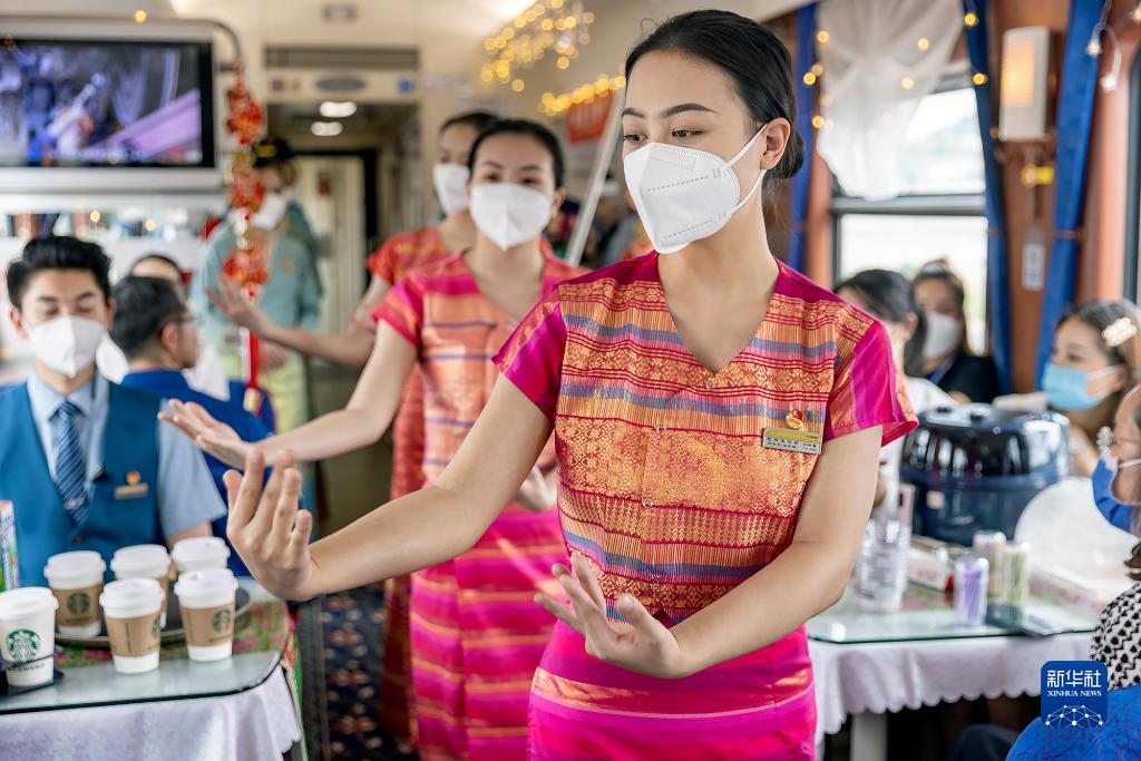 6月23日,乘务员为旅客表演老挝舞蹈。新华社发(陈畅 摄)