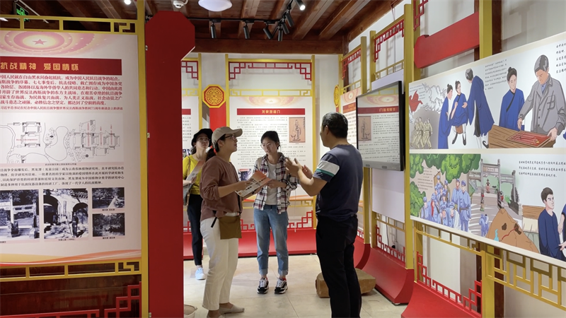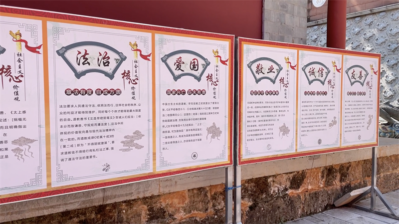 现在来到龙泉观,门前认真检查游客健康码和行程卡的工作人员,道观里迎风飘扬的国旗,道观内显眼的位置摆放的用道教经典阐释社会主义核心价值观的展板,道观东道院里的爱国主义教育展厅,都让这个古老的道观呈现出生动的时代气息。