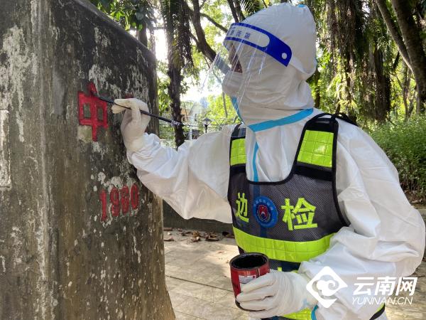 界碑前,民警们小心翼翼地清扫界碑,对界碑上的“中国”字样和编号细心地描红,使界碑始终干净靓丽,中国更“红”。与界碑为伴、与国旗同框、与中国合影,用顽强的坚守,向祖国深情告白!