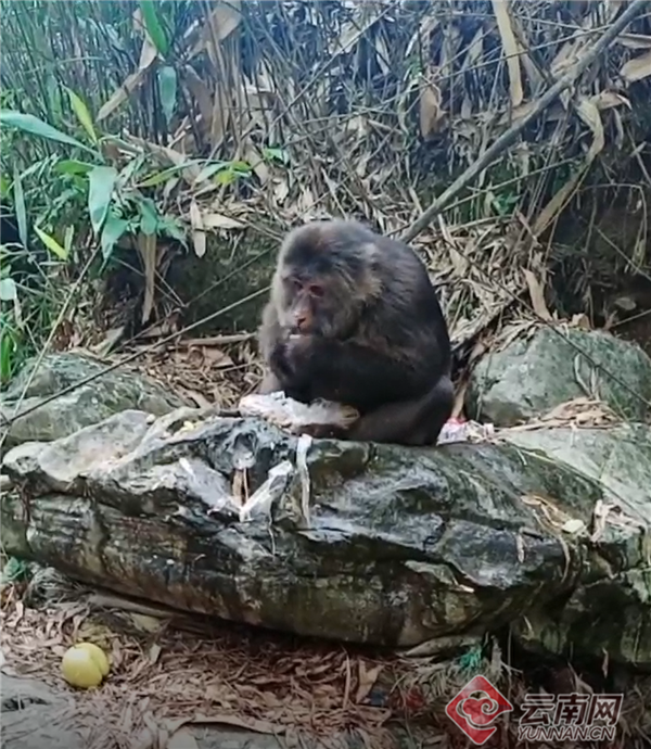 “来,吃颗花生米!”“来,合个影!”……日前,昭通市盐津县庙坝镇民政村一竹林岩石边突然出现一只国家二级重点保护动物藏酋猴,引来周围群众围观投食、合影。