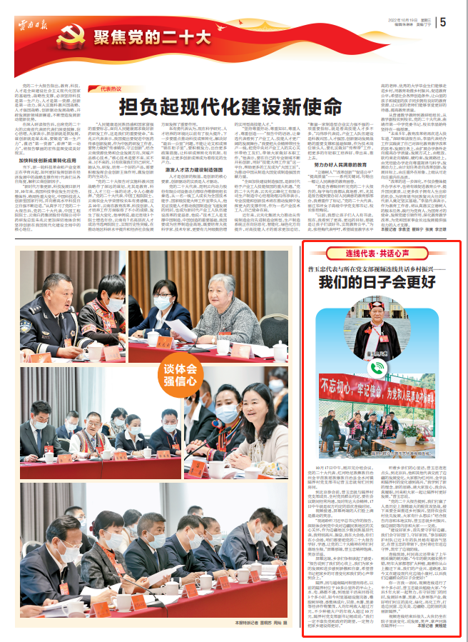 “现场聆听习近平总书记作的报告,深刻体会到党中央对边疆民族地区的关心关怀,作为边疆地区少数民族基层代表,我特别高兴、振奋。我在大会场,你们在小会场,咱们都要把党的二十大报告学好、学透,让党的二十大精神在咱们村落地生根。”屏幕那端,普玉忠精神饱满、笑容洋溢。