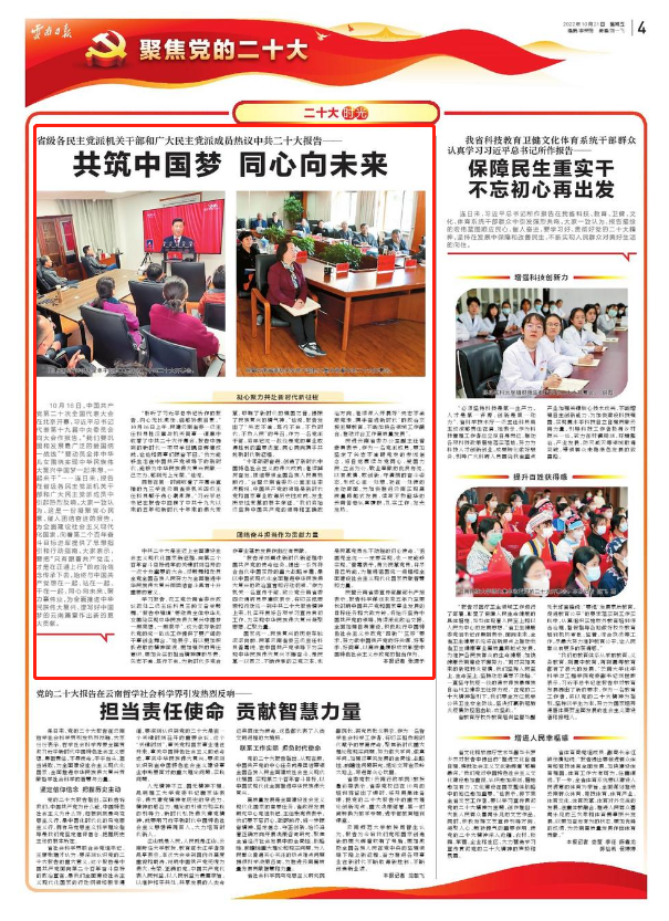10月16日,中国共产党第二十次全国代表大会在北京开幕,习近平总书记代表第十九届中央委员会向大会作报告。“我们要巩固和发展最广泛的爱国统一战线”“要动员全体中华儿女围绕实现中华民族伟大复兴中国梦一起来想、一起来干”……连日来,报告在省级各民主党派机关干部和广大民主党派成员中引起热烈反响。大家一致认为,这是一份凝聚党心民意、催人团结奋进的报告,为全面建设社会主义现代化国家、向着第二个百年奋斗目标进军提供了思想指引和行动指南。大家表示,要把“只有跟着共产党走,才是在正道上行”的政治信念传承下去,始终与中国共产党想在一起、站在一起、干在一起,同心向未来、聚力襄伟业,为全面推进中华民族伟大复兴、谱写好中国梦的云南篇章作出新的更大贡献。
