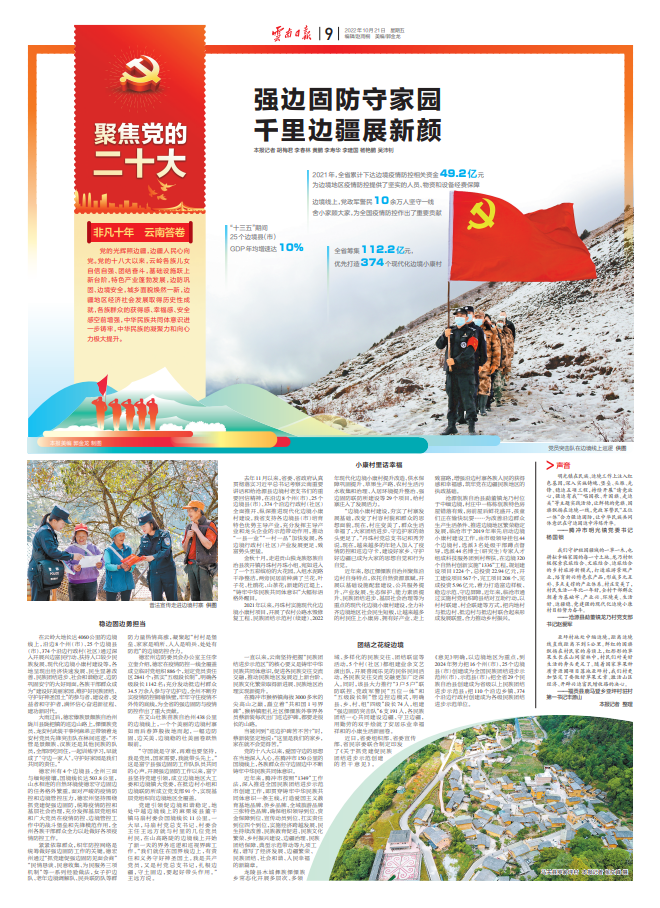 在云岭大地长达4060公里的边境线上,沿边8个州(市)、25个边境县(市)、374个沿边行政村(社区)通过深入开展兴边富民行动、扶持人口较少民族发展、现代化边境小康村建设等,各地呈现出经济快速发展、民生显著改善、民族团结进步、社会和谐稳定、边防巩固安宁的大好局面。各族干部群众成为“建设好美丽家园、维护好民族团结、守护好神圣国土”的参与者、建设者、受益者和守护者,满怀信心奋进新征程、建功新时代。
