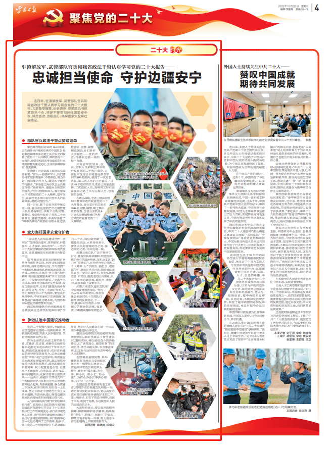 连日来,驻滇解放军、武警部队官兵和我省政法干警认真学习领会党的二十大报告,大家备受鼓舞,纷纷表示,要紧跟总书记紧跟党中央,坚定不移贯彻总体国家安全观,踔厉奋发、勇毅前行,确保国家安全和社会稳定。