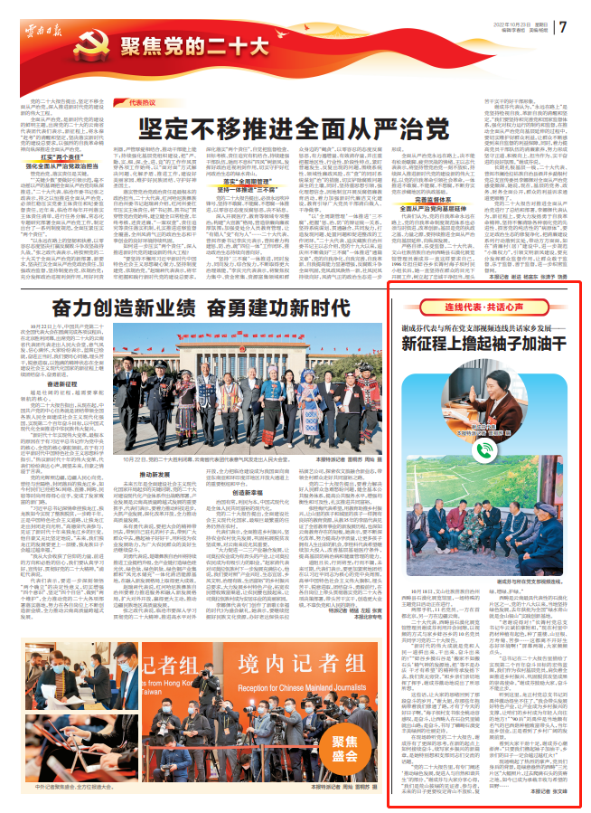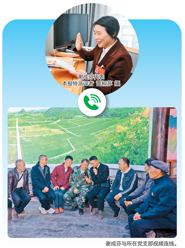 在现场聆听党的二十大报告,谢成芬有了更深的思考。在新的起点上如何接续奋斗,续写家乡振兴的新篇章,是她特别想和支部同志们交流的话题。