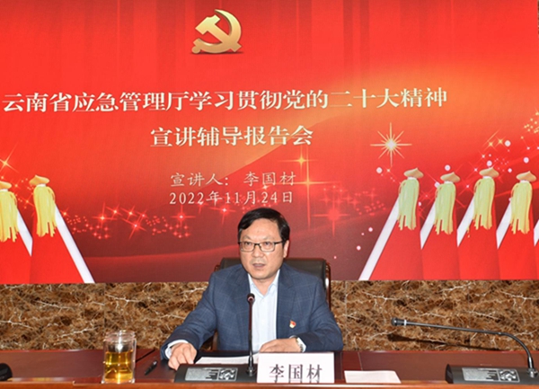李国材在系统总结党的二十大重大意义,全面阐释党的二十大精神实质基础上,结合应急管理使命任务,就贯彻党的二十大决策部署和掀起学习宣传贯彻党的二十大精神热潮提出了明确要求和举措。