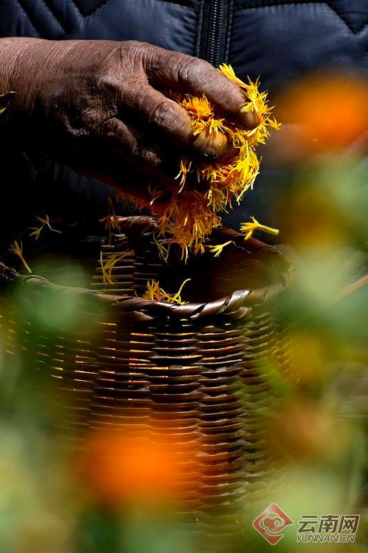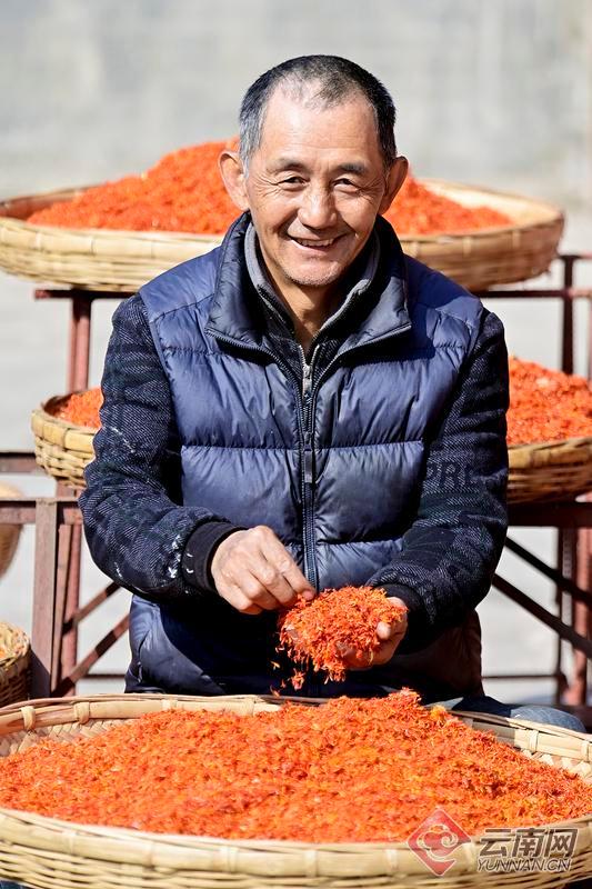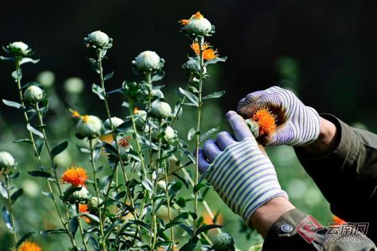 3月29日,大理白族自治州南涧彝族自治县公郎镇村民们正在田间采收红花。连日来,南涧彝乡公郎镇种植的1800亩滇红花迎来丰收,村民忙着采摘、晾晒。