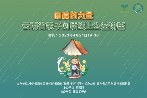 2023年云南省首场亲子阅读线上公益讲座,以书香文化之力推进全民阅读,让阅读成为青少年学生感悟人生、获得成长的有效途径,让书香弥漫在校园的各个角落,让书香成为校园文化的主旋律,不断为“书香彩云南”建设注入新活力,助推云南文化强省建设。
