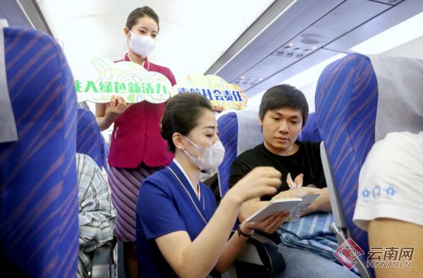 在主题航班上,南航乘务长高扬进行了客舱广播,向旅客传递南航社会责任理念。在知识问答互动中,乘务员为大家准备了关于社会责任和环保低碳的一系列问答题目,帮助旅客了解无纸化登机、机上按需选餐等绿色出行知识。航班上还定制了融入社会责任元素的专属印章,为踊跃参与的旅客们盖章打卡留念。
