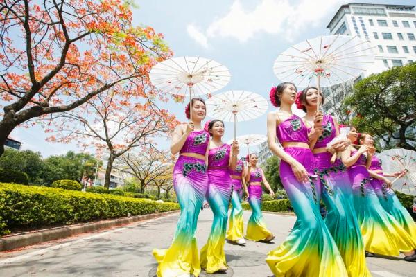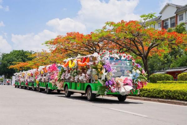 下午,灿烂缤纷的花车载着来自思茅区的11对钻石婚、金婚、银婚老人,8对在5月20日当天领证的新人,8对情侣,5对花童等,进行了巡游;凤凰花下的民族服装秀,展现了普洱独特丰富的民族文化;昆明聂耳交响乐团为市民带来大提琴、中提琴等弦乐四重奏,用《爱的致意》《今夜感觉我的爱》《雾夜中的幽会》传递浪漫思绪。随风飘落的花瓣下,优雅的交响乐缓缓流淌,洗去浮躁的情绪,音乐与美景与爱相得益彰。