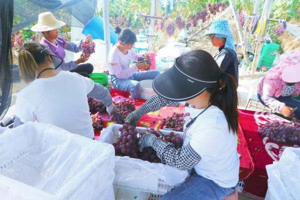 近日,走进云南普洱市景谷傣族彝族自治县永平镇芒东村,150余亩大棚葡萄正值丰收,红的、紫的缀满藤架,晶莹饱满似串串玛瑙,农户们忙着采摘、分拣、装箱,这些葡萄即将售往贵州、北京等全国各地。