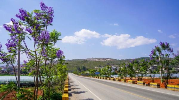 行驶在白团线建水至西庄路段上,沿途错落有致的蓝花楹、三角梅等绿植与“泸江烟柳”景观道构成一幅如诗如画的公路风景。