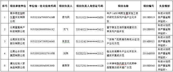 按照国家和省科研诚信管理相关政策规定,现将违反云南省科技计划项目及资金管理规定,项目严重逾期未验收、项目终止未按规定退回财政科技经费的南华县宏怡野生菌开发有限公司等23个项目单位及廖为民等23名项目负责人纳入科研严重失信行为记录名单,现予以通告。