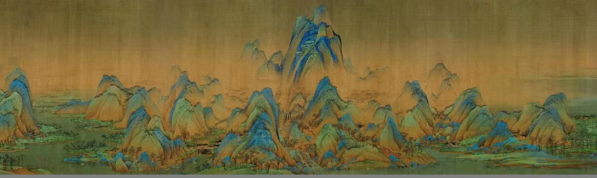 《千里江山图》是北宋画家王希孟创作的绢本设色画,画面上峰峦起伏绵延,江河烟波浩淼,气象万千,壮丽恢弘。此卷以概括精炼的手法、绚丽的色彩和工细的笔致表现出祖国山河的雄伟壮观,被视为宋代青绿山水中的巨制杰构,是中国十大传世名画之一。