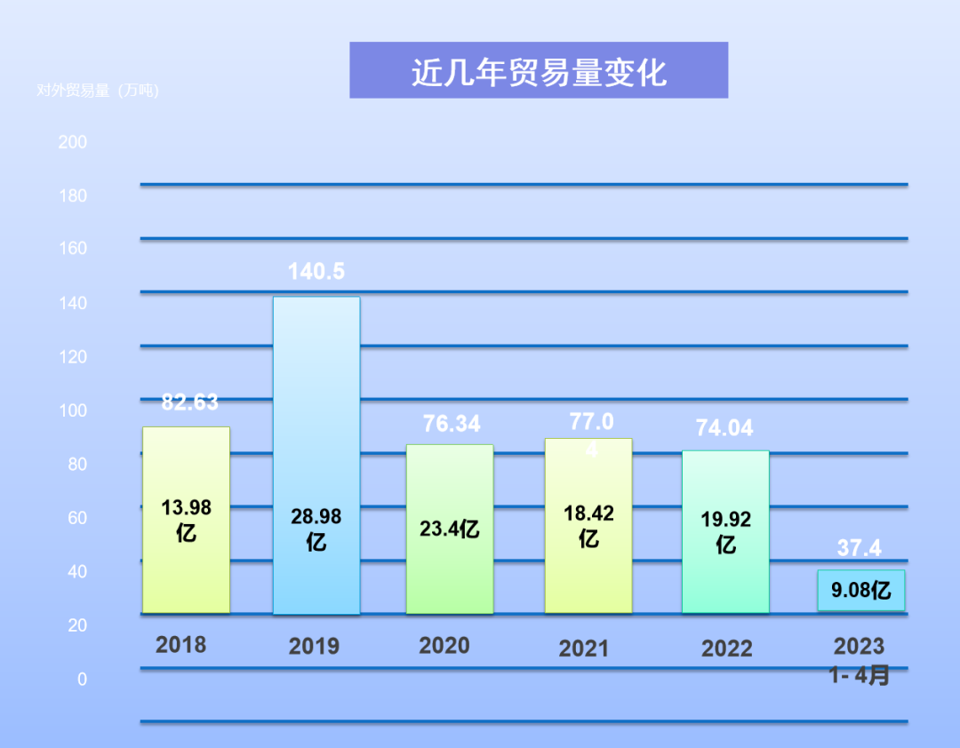 2023年(1-4月),进出口贸易量37.4万吨,同比增长1342.2%。进出口贸易额9.08亿元(人民币),同比增长489.2%,增长势头强劲。