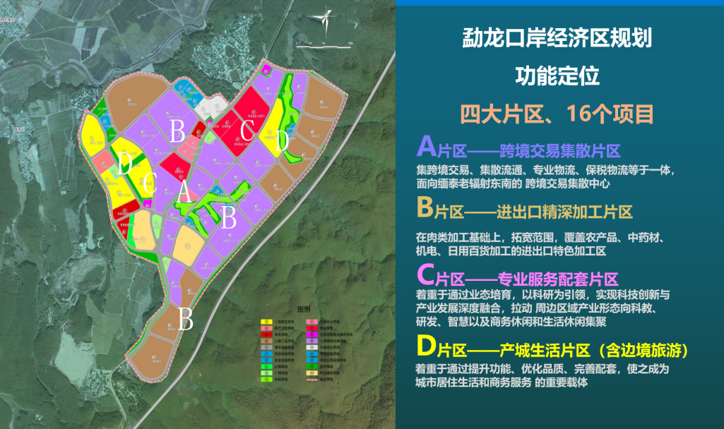 勐龙口岸经济区规划面积3平方公里,设置ABCD四大产业功能区,包含16个项目。