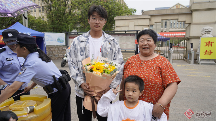 ,结束高考的学生走出考场,家长送上祝福,不少考生和父母、同学一起合影留念。