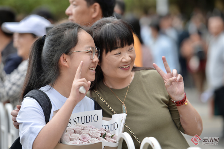 各大校区,结束高考的学生走出考场,家长送上祝福,不少考生和父母、同学一起合影留念。