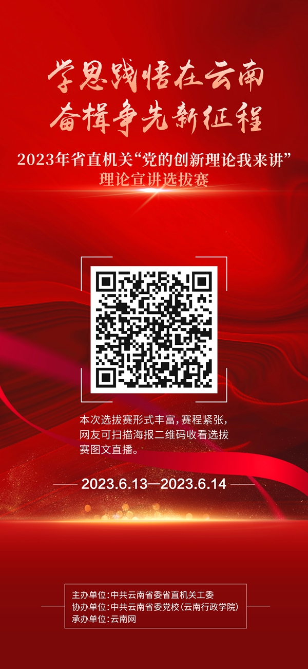 云南网讯(记者 张淑婷)6月13日,由中共云南省委省直机关工委主办,中共云南省委党校(云南行政学院)协办,云南网承办的2023年省直机关“党的创新理论我来讲”理论宣讲选拔赛在昆明开幕。