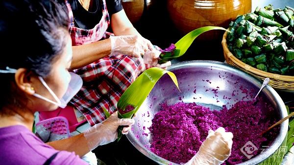 李雪家的彩色粽子主要以紫色和黄色为主,虽然制作工序繁琐,但对于勤快的李雪来说,显得非常轻松。将紫蓝草和粗糠花清洗干净,分别经沸水煮20多分钟,汤汁便成了浓浓的紫色和黄色,待凉透倒入糯米中,盖上竹筛浸泡一夜,白色的糯米染透到米心,蒸熟后就可放入各种口味的馅料包装粽子了。李雪介绍,选用细棕叶包粽子很费时,但包出的粽子更入味更清香,且大小合适,老少皆宜。