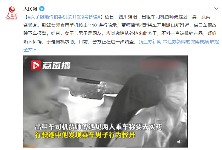 近日,四川绵阳,出租车司机贾师傅遇到一男一女两名乘客。副驾女乘客用手机按出"110"进行暗示,贾师傅"秒懂"将车开到派出所附近,借口车辆故障下车报警。经查,女子与男子是网友,应其邀请从外地来此务工,不料一直被推销产品,疑似陷入传销,于是伺机求助。目前,警方正在进一步调查。