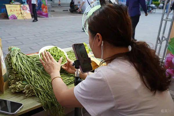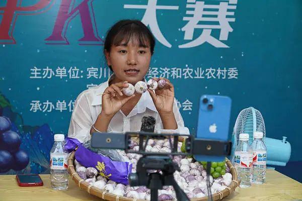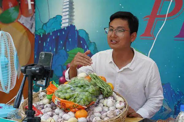 在全民健身中心旁直播带货大赛现场,进入决赛的主播团队激情澎湃、妙语连珠,借助巧妙的设计、生动的语言,对贡菜、葡萄、大蒜等农特产品进行全面展示和推介。