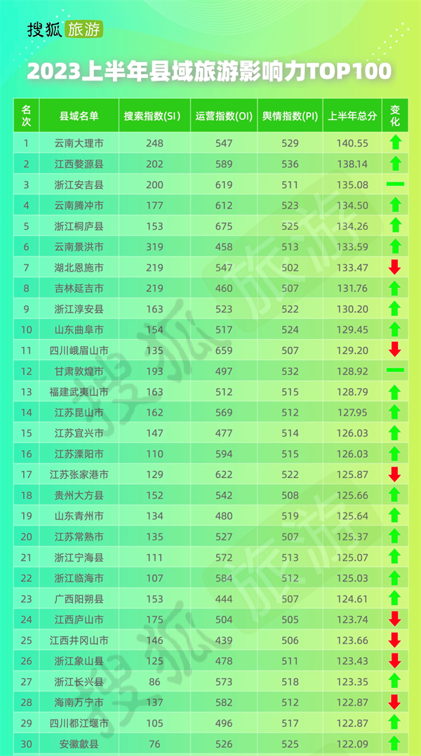 近日,搜狐旅游综合2023年前6个月各县域每季度品牌传播运营、网络搜索和口碑舆情指数,发布了《2023上半年县域旅游影响力TOP100》榜单。