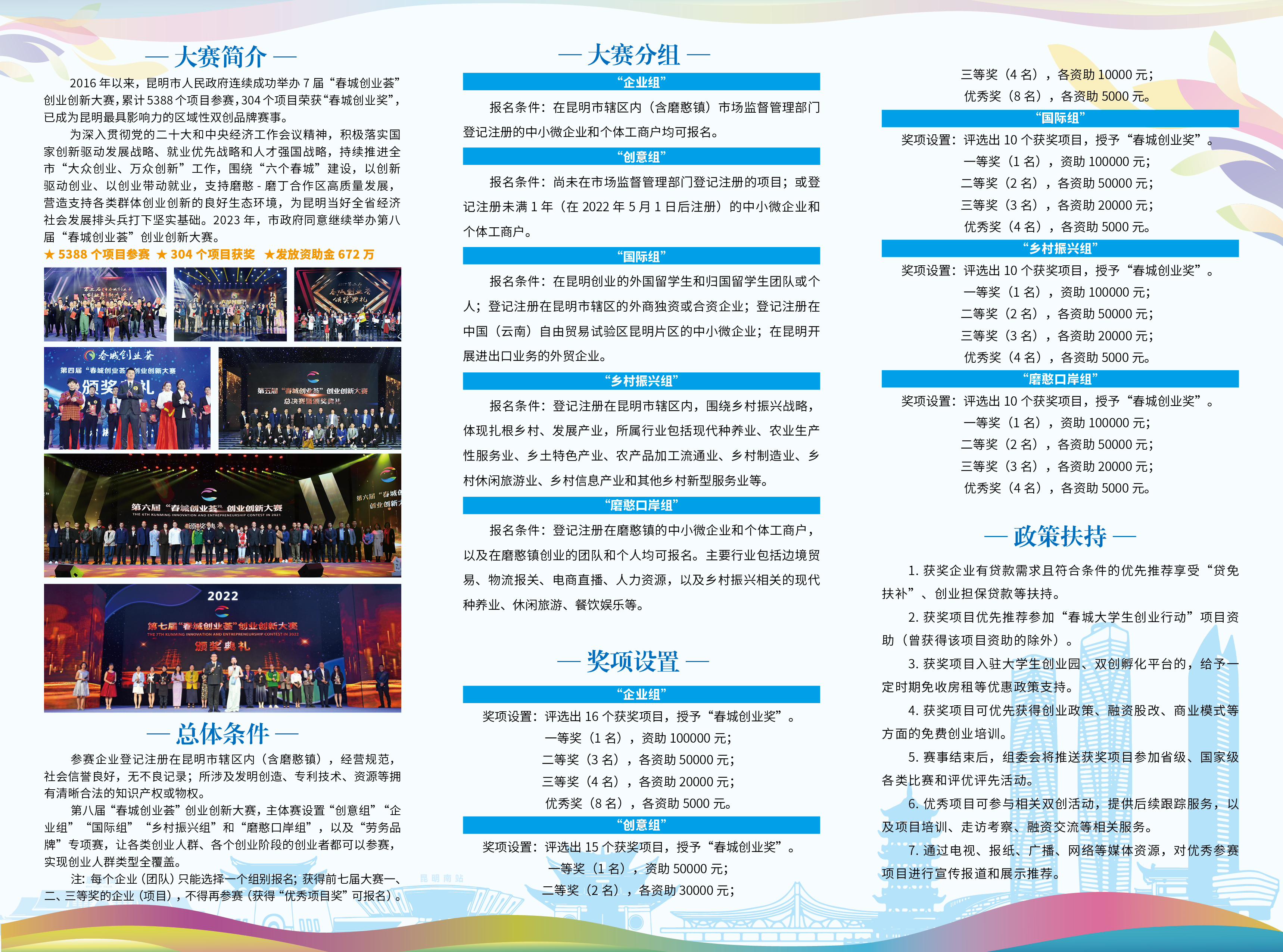 大赛将从7月持续到12月,按照新闻发布会、项目报名、海选、初赛、复赛、决赛及颁奖典礼等阶段开展。其间,组委会还将配套开展“春城创业行”跟踪帮扶活动和“春城创友荟”创业交流活动。邀请相关部门、权威专家和创业导师,对企业进行持续跟踪帮扶,为创业者把脉问诊、答疑解惑,拓展大赛线下服务。