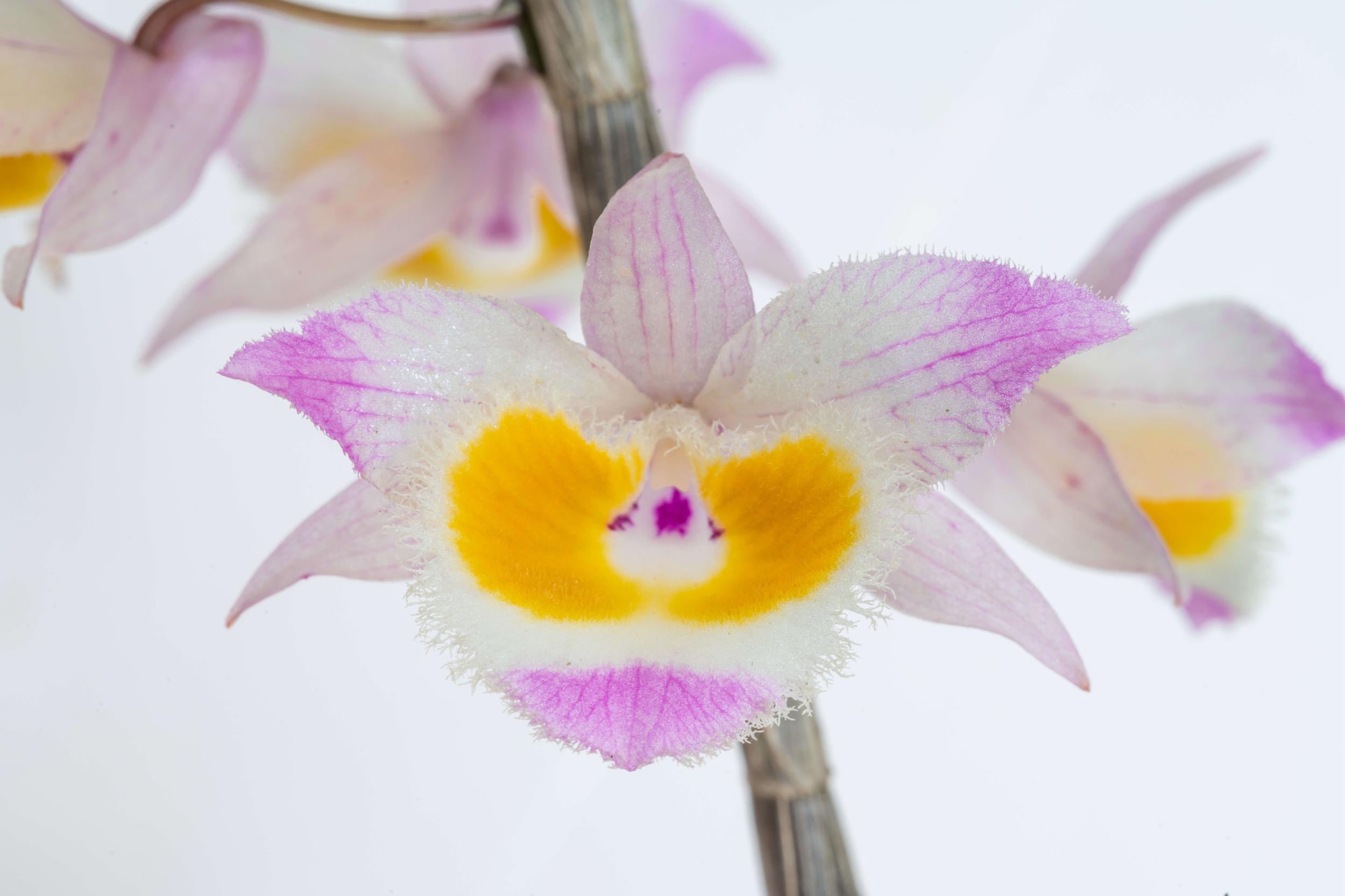 齿瓣石斛,茎下垂,细圆柱形;叶鞘常具紫红色斑点;花序生于落叶的老茎上,具1—2朵花,质地薄,有香气;唇瓣白色,近圆形,基部边缘具复式流苏,上面密布短毛;唇盘两侧各具1个黄色斑块。花期为4—5月。