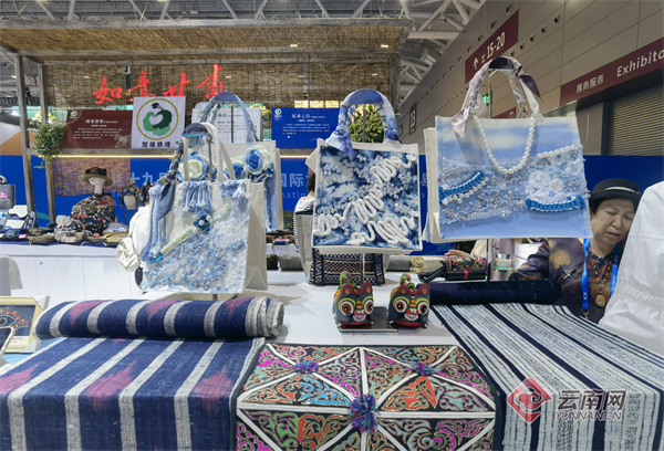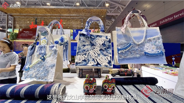 为了适应年轻人的审美观念,公司还带来了文山学院学生设计制作的作品。学生们把传统的非遗和现代的技艺手法相结合,采用了蜡染、珠绣等工艺做成手提包系列产品,将云南的蓝天白云放在包上带到了深圳。