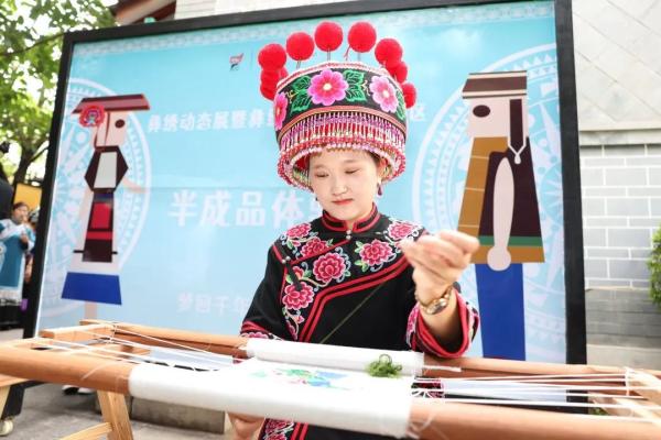当千年彝绣与古镇相遇,不仅是一场传统技艺与现代时尚牵手的视觉盛宴,更是一次与非遗传承人互动的沉浸式体验。来自昆明的游客江昱霏拿起绣花针,在绣娘的指导下开启了自己的非遗之旅,她笑着对记者说:“以前只是在电视上看过彝绣,今天可以在楚雄近距离体验非遗,对我来说是一次珍贵的经历,希望楚雄彝绣可以推广到全国各地,让更多的游客感受、体验彝绣的魅力。”