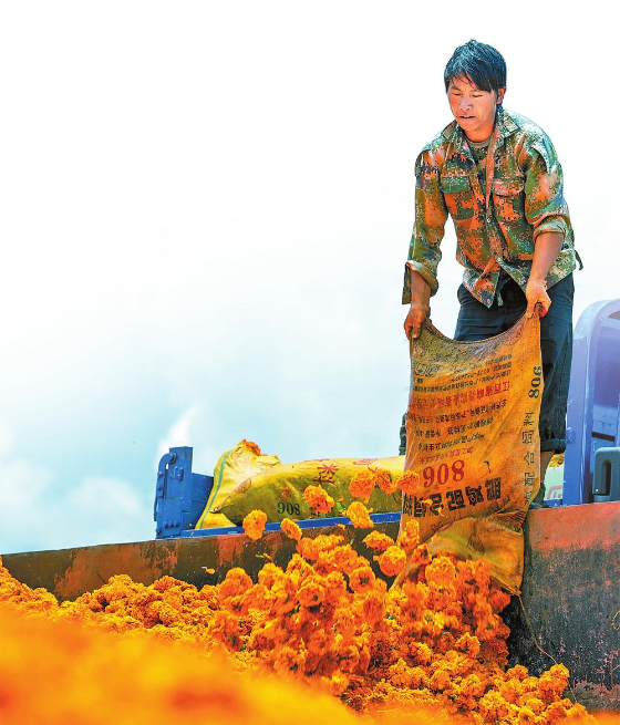 目前,西北勒乡万寿菊亩均产量达2吨多。按当前市场收购价估算,该乡今年万寿菊产值预计达2800万元,成为助力群众增收的“致富花”。