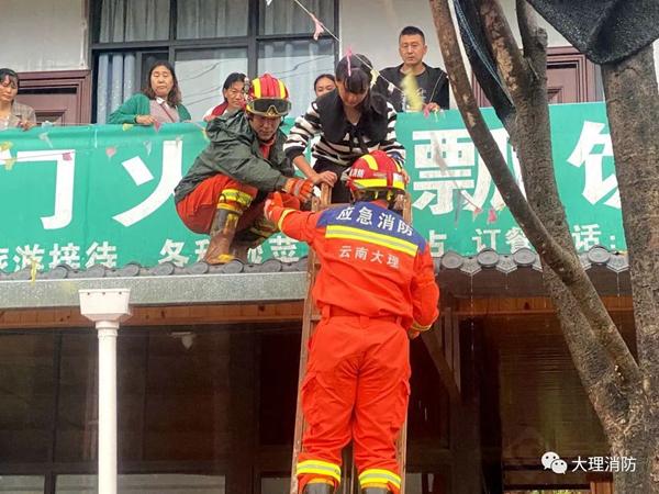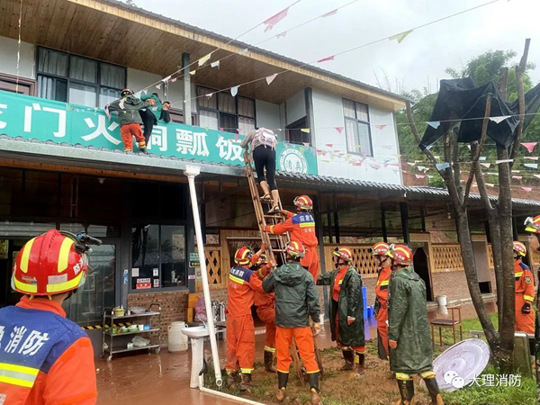 云龙县诺邓镇大西坡一餐饮店后方山体发生垮塌,导致二楼疏散楼梯被掩埋,造成10名群众被困,接警后,大队迅速出动3车15人前往救援,到达现场后,消防救援人员使用拉梯对被困人员及群众财产进行疏散,多名救援人员下方固定拉梯及辅助救援安全,两名救援人员上到二楼引导保护被困群众疏散,所有被困人员疏散到一楼后,在消防救援人员的帮助下成功疏散到安全地带。