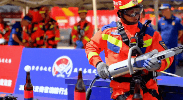这一动作不禁让人凝神注目,因为这不是简单地切割5根铁丝,这些铁丝位于灯泡上方,而两者之间几乎没有空隙,必须对力量、角度、时间精准把控,细致小心操作,稍有不慎灯泡就会破碎。现场参赛选手沉着冷静、沉稳操作,操作台上,5个灯泡整齐摆放,灯泡上紧贴直径2毫米的钢丝,参赛选手精准操控10公斤重、每分钟4700转的无齿锯聚精会神切割灯泡上的铁丝,一根根铁丝被整齐切断,操作一气呵成,考验的是参赛选手在救援中面对可能存在的障碍物用尽可能短的时间和科学的方法破拆、施救,因为在真正的灭火救援中,时间就意味着生命。